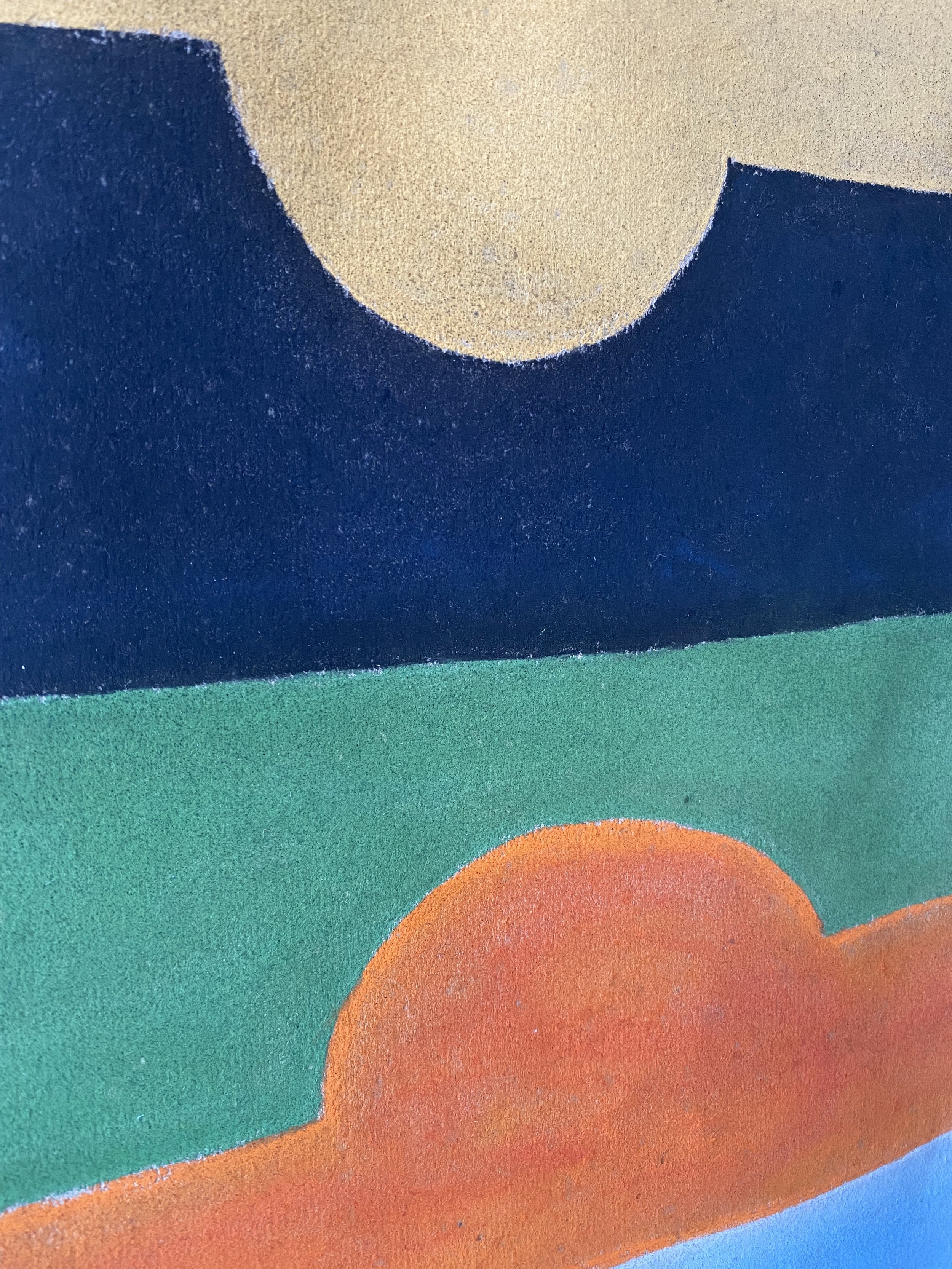 The third part of the 3 part series involves both cool and warm tones made with chalk pastels on paper. Each piece is carefully drawn and filled with at least 3 layers of chalk. The effect is highly pigmented due to the use of a unique finger pressing and rubbing technique which repeatedly pushes colour into the paper.